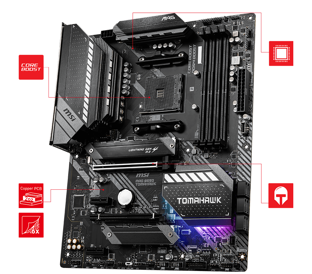The MSI MAG B550 TOMAHAWK motherboard supports AMD Ryzen 3000 series and WiFi 6 for high-speed connectivity.